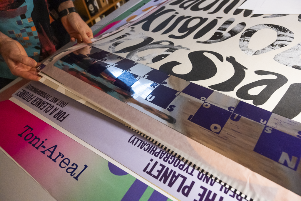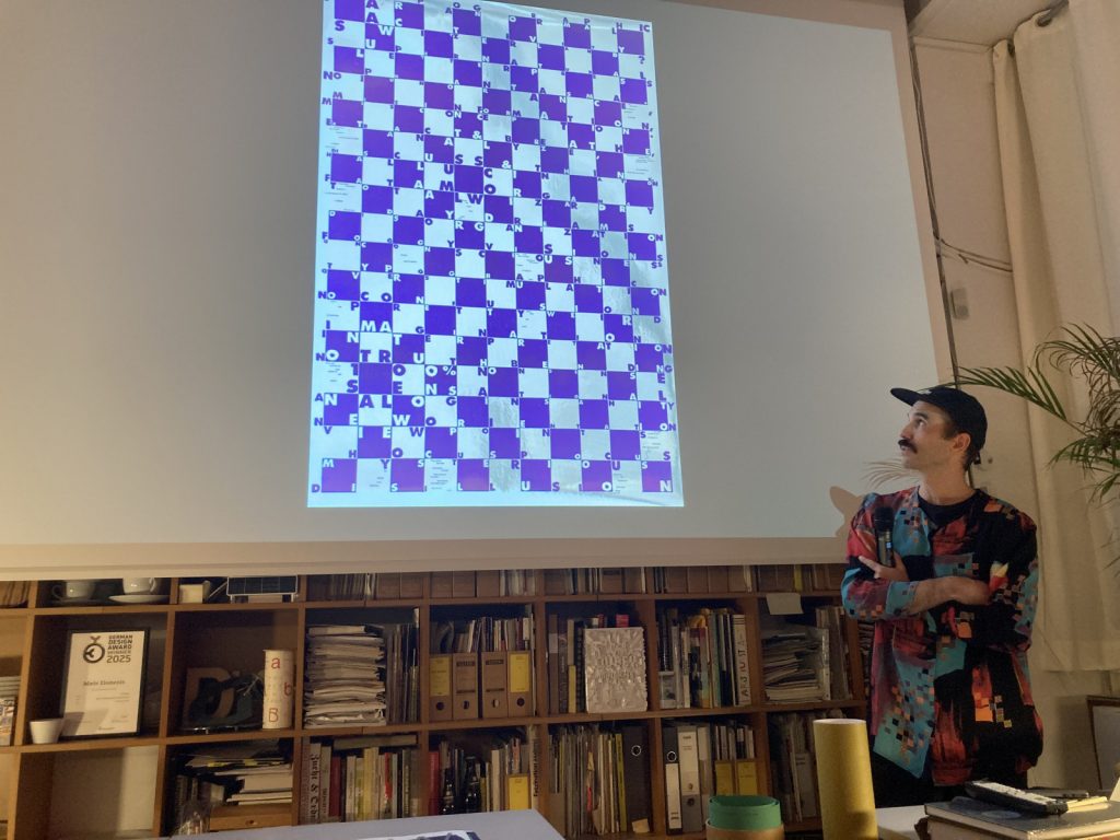 Dafi, der uns an diesem Abend einen Einblick in seine Arbeit gewährte, ist Grafikdesigner und Letterpress-Plakatgestalter. Er erzählte von seinem Atelier mit Druckpressen, viele davon aus den 1960er-Jahren, und zeigte in seinem Vortrag nach und nach verschiedene Poster und Posterserien. Häufig umriss er den Kontext und die Zielgruppe der einzelnen Poster, so gestaltete er ein Poster für die RICE University und druckte recht abstrakte Varianten der Buchstaben R, I, C und E auf seine Posterserie. Für Außenstehende vielleicht nicht direkt erfassbar oder lesbar, sei Lesbarkeit immer eine Frage der Zielgruppe, so Dafi. Er erwarte von Personen auf dem Campus der RICE University auch die Fähigkeit, die Buchstaben auf den Postern zu erwarten und zu dechiffrieren. Auf die Aussage, Lesbarkeit sei eine Frage der Zielgruppe, folgte ein Lachen aus dem Publikum – insgesamt war der Vortrag geprägt von recht viel Lachen oder doch zumindest Schmunzeln.