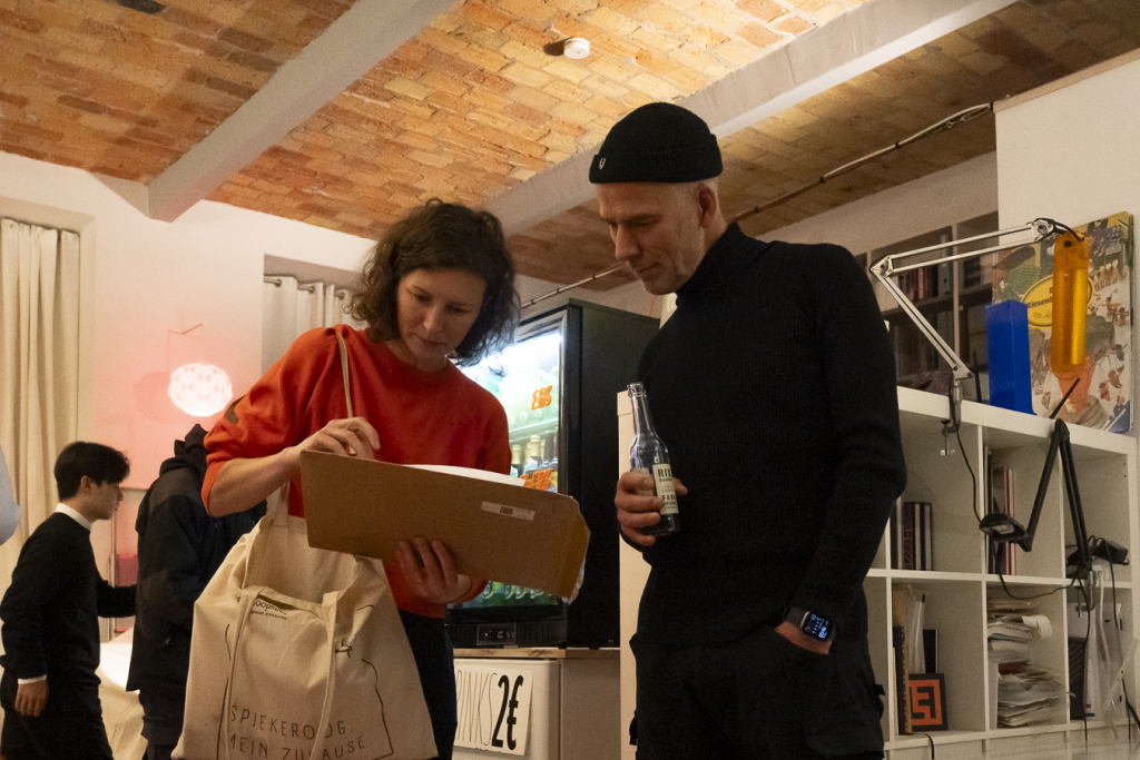 Jubiläum und Abschied – und Neubeginn?Stadtbahnbogen 424, 10557 Berlin – volles Haus an jetzt schon legendärer Adresse …Museumsgründerin Barbara Dechant (hier im Interview vom Museumsverband) und Vorstandsmitglied Till Kaposty-Bliss atmen zu Beginn des Abends noch einmal tief durch.Publikum auf der Innenseite der Eingangshalle mit einem besonderen Hingucker im Hintergrund. Alle Fotos: Team Typostammtisch