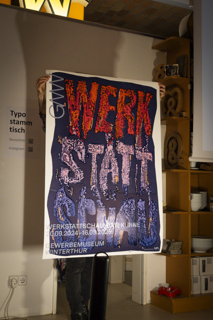 Alle warten in Vorfreude, während die letzten Personen noch den Raum betreten.Auch vor dem Vortrag ist schon Zeit für Wiedersehen und Austausch.Los geht’s!Dafi zeigt die Wirkung einer optischen Täuschung, die er für die Gestaltung eines Posters nutzt (die Linien sind parallel!).Wenn Dafi im Vortrag von einem Plakat erzählt, das er auch physisch dabei hat, so hält er es zwischendurch hoch und spricht dabei weiter.Zum Gestaltungsprozess dieses Posters erzählt Dafi: „Das Auswaschen im Waschbecken war dann wirklich unschön. Da hab ich die Ätzung in die Autowaschanlage gebracht.”Nach dem Vortrag: großer Andrang an den zwei Tischen, auf denen Dafi seine Poster ausgelegt hat.Detail der Poster. Auch die Materialität spielte insgesamt eine große Rolle im Vortrag und in den Gesprächen.Immer wieder schön zu sehen, dass der Typostammtisch auch unabhängig vom jeweiligen Vortrag des Abends eine willkommene Gelegenheit zum Austausch bietet. Kleine Stärkung vor dem TypostammtischWährend des Anschauens der Poster werden weitere Fragen gestellt und beantwortet.
