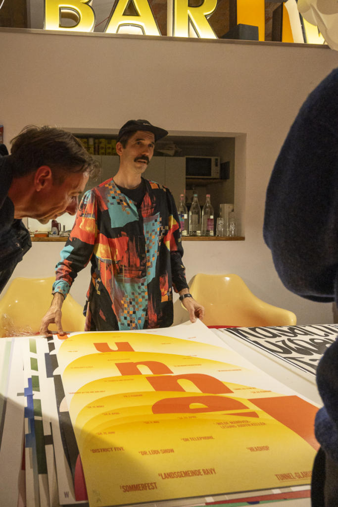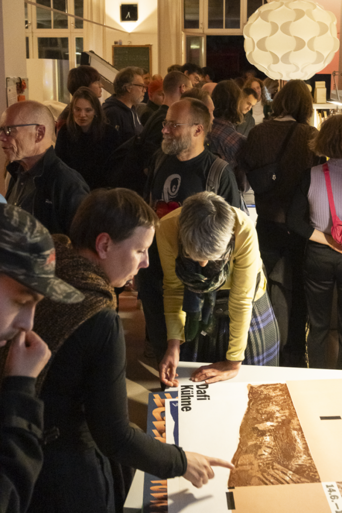 Nach dem Vortrag durften wir einige mitgebrachte Plakate in echt ansehen, viele davon im Weltformat und damit einen ganzen Tisch ausfüllend. Der Abend endete mit Getränken, langen Gesprächen, allgemeinem Staunen und Beseeltheit von so viel Leidenschaft fürs Handwerk. Danke an Dafi und alle Besucher·innen!